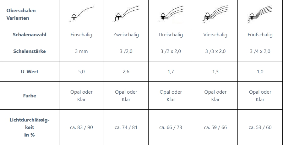 Die Lichtkuppel-Oberschale aus Polycarbonat (PC) entspricht der europäischen Norm EN 1873. Polycarbonat (PC) ist bis – 40 °C sehr schlagfest, zäh und splittert nicht. Ideal gegen Hagel. Die Schlagfestigkeit von Polycarbonat ist 250 x höher als die vom Glas mit einer gleichen Stärke. Das System ist funktionssicher und mit CE gekennzeichnet. Durch kontinuierliche Kontrollen während der Fertigung wird eine optimale Qualität gewährleistet. Brandklasse: B-s1, d0 , EN 13501